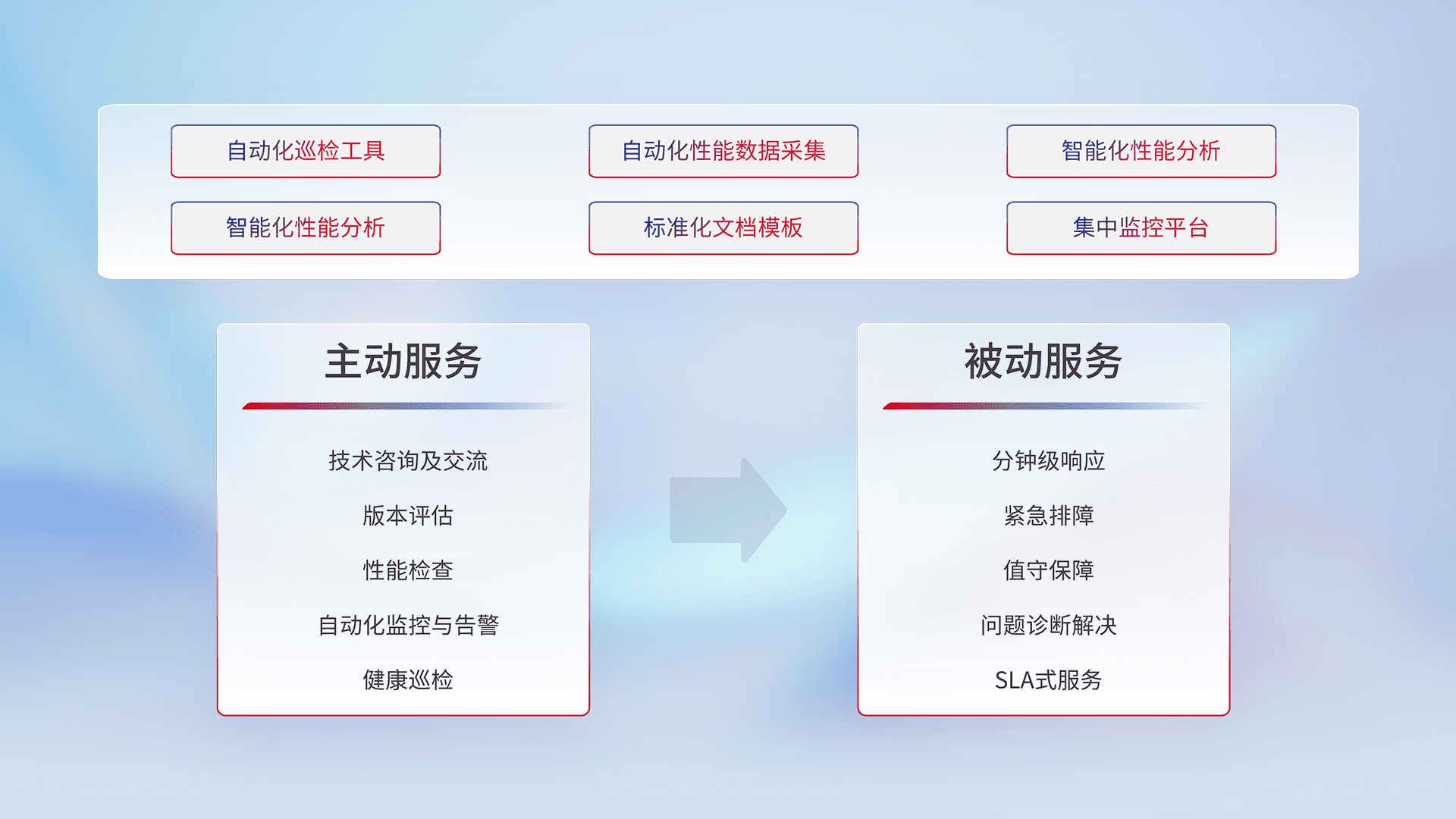 智能化工具和标准化文档,,,,保障服务质量,,,,提供主动服务(包含技术咨询、、、、版本评估、、性能检查、、自动化监控与告警、、、、健康巡检)和被动服务包含(分钟级响应、、、、紧急排障、、、、值守保障、、、问题诊断解决、、SLA服务)。。。